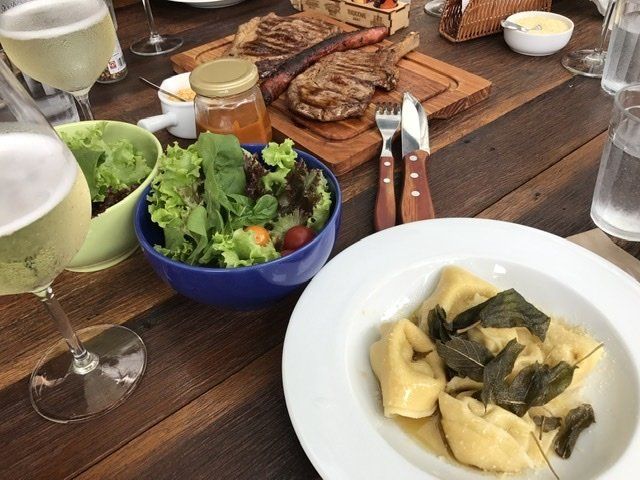 Conheça a adega do restaurante para escolher o vinho ou os vinhos da noite e não saia de lá sem provar o tortéi à Moda da Casa, recheado com moranga, tomate seco, nata, cebolas e castanhas tostadas.